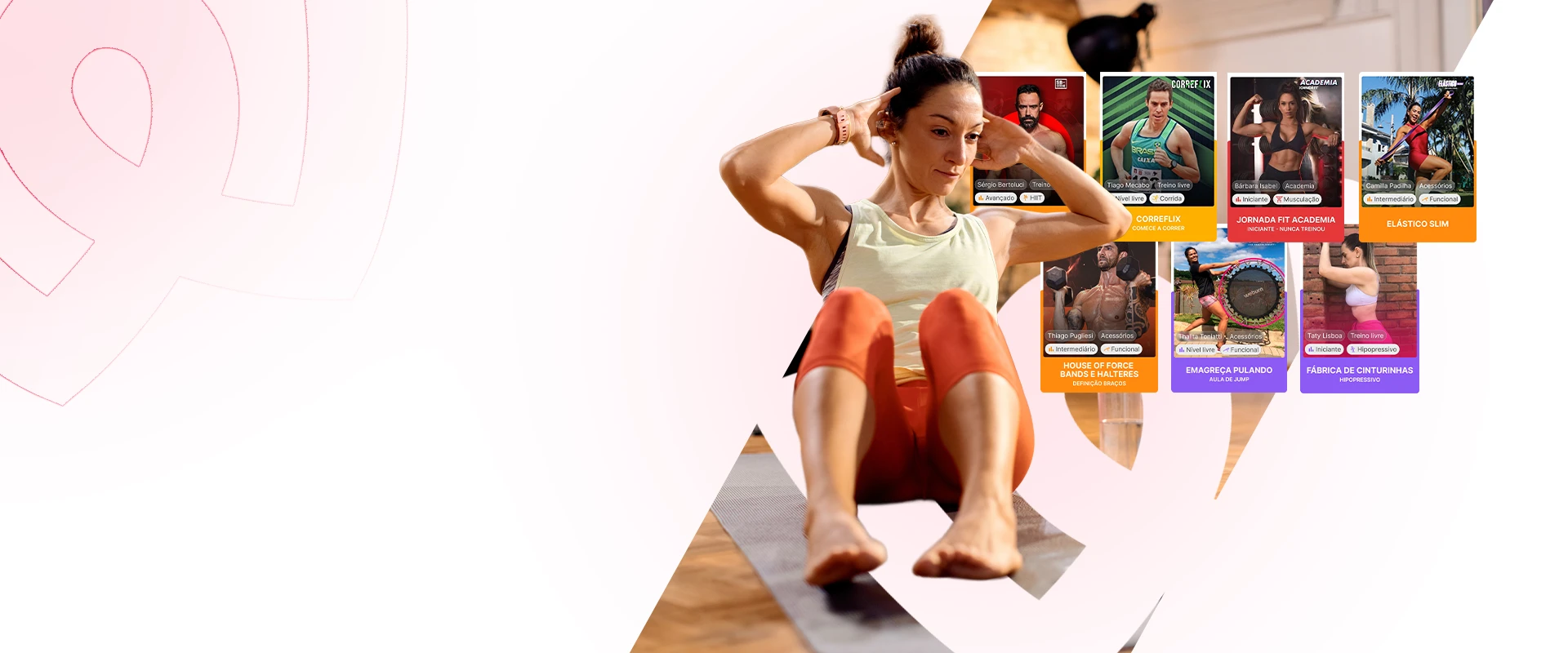 No total: +60 programas, +3.500 aulas, +20 modalidades — mas você não precisa se preocupar com isso. O app organiza tudo pra você.
